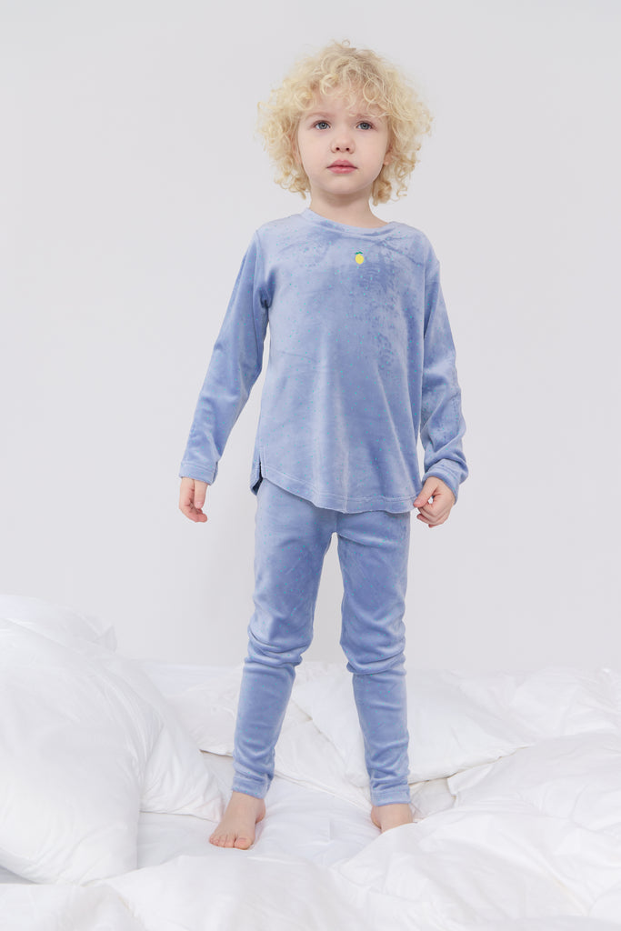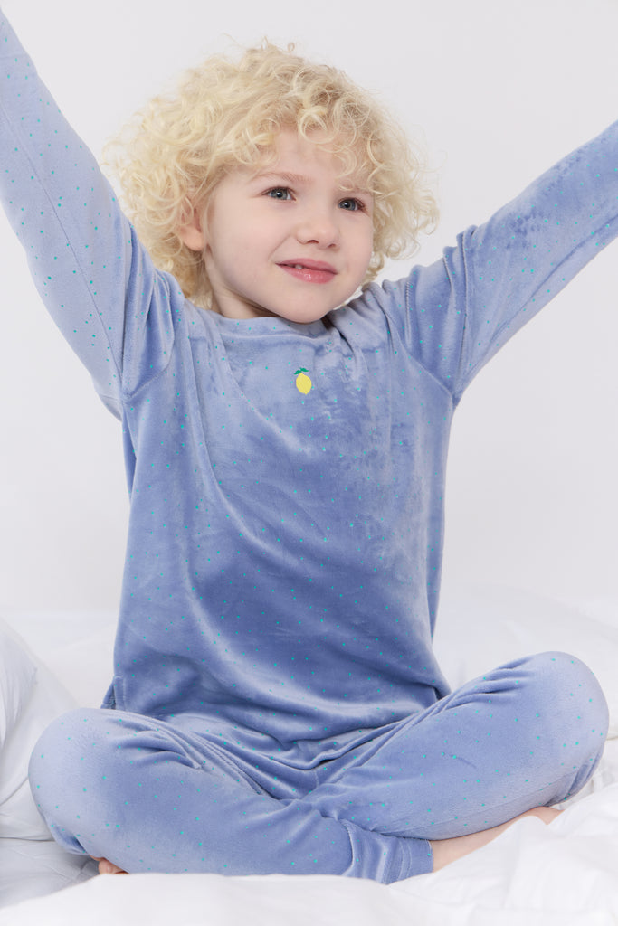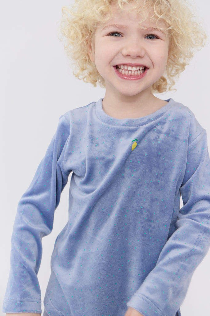 Cozy dot-print set with an all-over dot pattern and cherry/lemon detail. Comes in Blue and Pink.