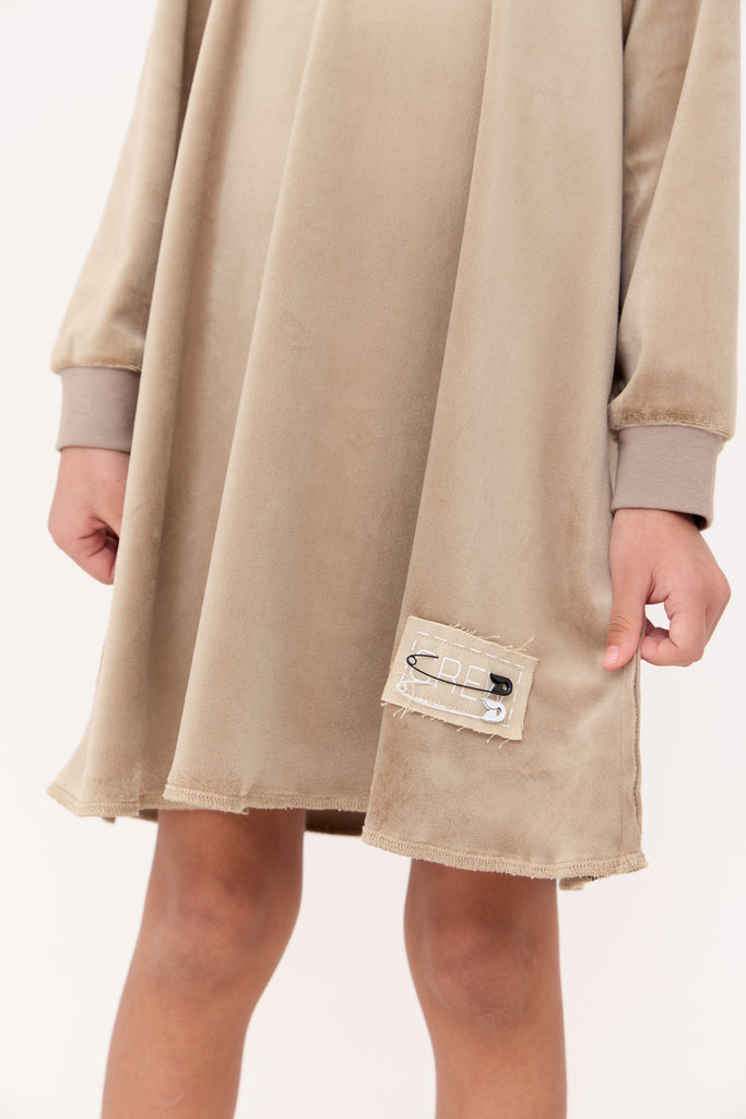 Dress with Crew patch and colored safety pin details. Comes in Black and Taupe.